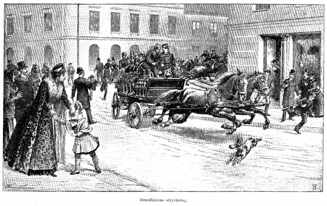 När brandkåren rycker ut bär det av i skenande trav från huvudstationen vid Johannis kyrkogård och nerför Malmskillnadsgatan. På varje sprutvagn sitter ett halvt tjog unga kraftiga män i full utrustning med hjälmar och tillbehör, och bredvid kusken på främsta vagnen ser man brandchefen själv, kommendörkapten B. Hollsten.